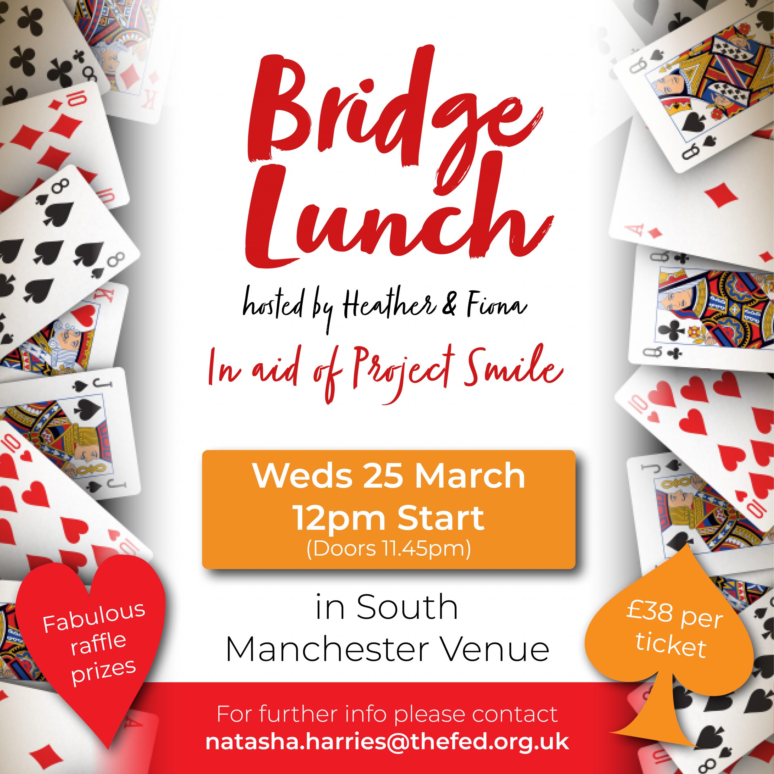 Join us on Wednesday 25 March for a wonderful afternoon of bridge, good food, and great company in south Manchester. Whether you’re playing duplicate or rubber bridge, we welcome players of all levels to take part in this relaxed and enjoyable fundraising event in support of Project Smile.