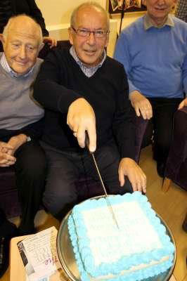 Dolly and “her boys” with Malcolm Clyne group chairman, seated, cutting the cake.