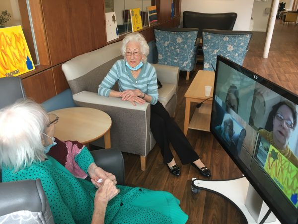 Karen Sonenberg and her sister Bev Doyle have recently enjoyed several video visits with their Aunt Joyce, facilitated by the home’s activity team, on one of two giant 42–inch touchscreen ‘tablets’. fitted with wheels wheeled, which can be easily moved to people’s rooms or quiet sitting areas.