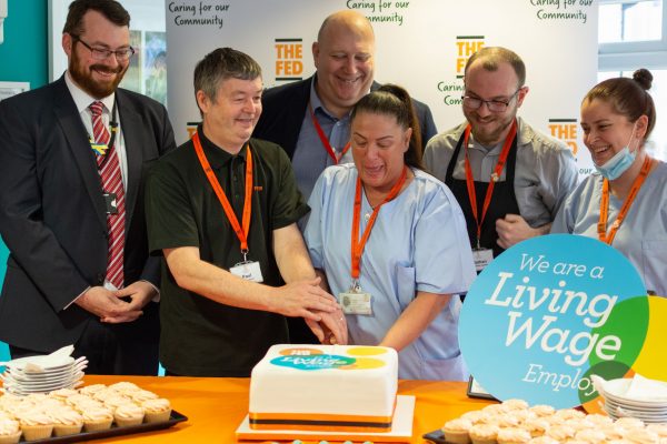 Members of The Fed’s Porters, Catering, and Care teams cut a commemorative cake to mark The Fed’s inclusion as a real leaving wage employer,